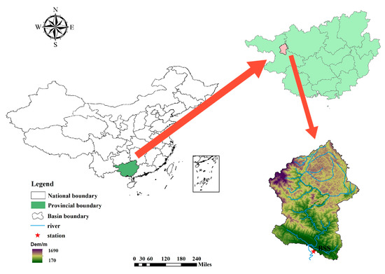 The Chengbi River Reservoir is located in Baise City, Guangxi Province, downstream of Chengbi River, (106°21′ E–106°48′ E, and 23°50′ N–24°45′ N) (Figure 1). It is the second-largest earth-rock fill dam reservoir project in China, with a total storage capacity of 1.15 billion m3 and a normal storage level of 185 m. The engineering characteristics parameters of the reservoir are shown in Table 1. It operates under the rule of a single FLWL for the entire flood season, resulting in a low storage rate after floods and a large waste of flood resources. The average precipitation of the watershed over the years is 1560 mm, and the rainfall is unevenly distributed during the year, mostly concentrated in April to September, accounting for more than 85% of the annual rainfall. The flood season of the Chengbi River is from 13 April to 31 October with a low storage rate after flood season. The data selected in this paper are the daily precipitation and daily measured runoff from Ba Shou Station (BSS) from 1963 to 2016, and the four index factors (average daily rainfall, maximum daily rainfall, average daily runoff, and maximum daily runoff) which reflect the characteristics of the flooding period are used as the basic data of staging.