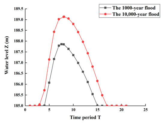 The maximum water level obtained from the flood regulation calculation in the main flood season is used as the control water level to raise the FLWL in other stages. Flood regulation calculations for the 1000-year and 10,000-year flood process lines in the main flood season starting at 185 m. The reservoir operation policy of flood regulation is that when the reservoir inflow is less than the rated storage outflow at the FLWL (1800 m3/s), gates are used to control the outflow is equal to the incoming flow so that the water level in the reservoir could maintain the FLWL. When the reservoir inflow is greater than 1800 m3/s, the gates are fully open to discharge flow. When the reservoir water level falls back to the FLWL, the discharge is controlled by the gates to keep the water level unchanged. The change of water level in the flood regulation calculation is shown in Figure 2. Then, the highest water level in the 1000-year flood regulation calculation in the Chengbi River Reservoir during the main flood season is 187.85 m, and the highest water level in the 10,000-year flood is 189.13 m, which are used as the control levels in the flood regulation calculation during the pre-flood season and post-flood season.