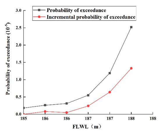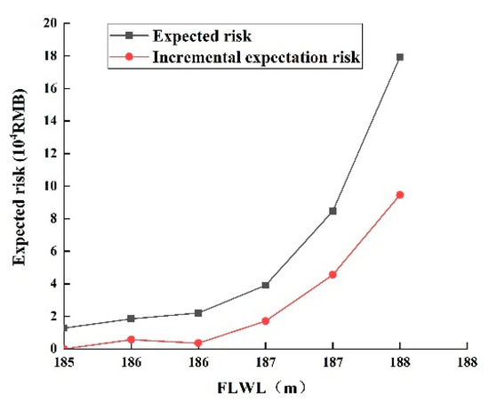 The paper calculates the FLWL for the post-flood season in 0.5 m increments to obtain probability of exceedance and its increases for different starting water levels (Figure 3), and the expected risk and expected risk increases (Figure 4). When the FLWL is set at 187.5 m in the post-flood season, the maximum probability of exceedance is , which is less than the reservoir calibration flood of . Compared to the original flood level, the probability of exceedance increases by . From Figure 3, it can be seen that when the FLWL is 185 m~186 m, the probability of exceedance changes very little and the trend of increasing probability of exceedance is moderate. However, when the FLWL is 186–187.5 m, the probability of exceedance tends to increase abruptly. The probability of exceedance of the average FLWL of 186 m in the post-flood season is , which is an increase of compared to the original level. From Figure 4, it can be seen that when the FLWL is set at 185–186 m, there is little trend in the expected risk of flood protection. However, when the FLWL is set at 186–187.5 m, the expected risk increases steeply.