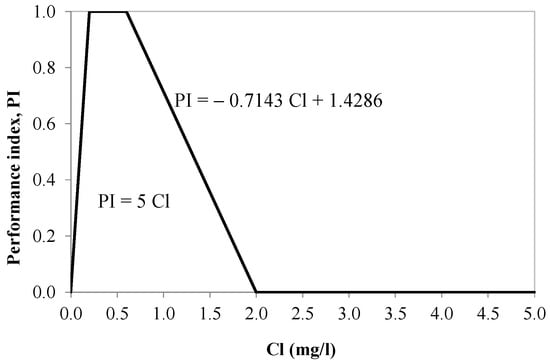 where Cl is the free chlorine concentration (mg/L) and PI is the performance index, ranging from 0 (no-service situation) to 1 (optimum performance). The proposed free chlorine performance function is depicted in Figure 2.