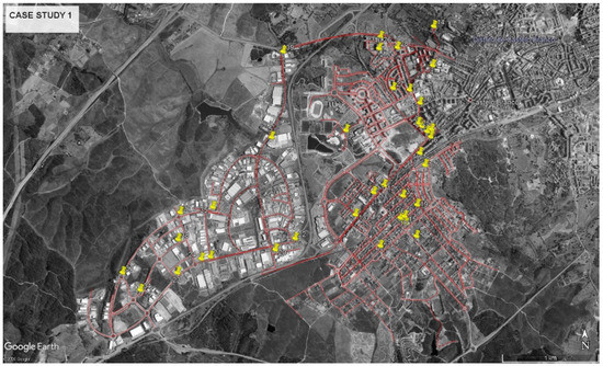 Case Study 1, the Costeira water distribution network, supplies part of the city of Castelo Branco, in Portugal (Figure 3). This network comprises one storage tank and 116 km of pipes that serve approximately 5900 branches. The network pipe materials are polyvinyl chloride (PVC) (93%) and ductile iron. The network is divided into 12 district-metered areas (DMAs). The supplied water volume in 2019 was 1.1 Mm3 to domestic and industrial water users. The water demand in August 2020 (152,906 m3) was approximately 50% higher than that in February (96,969 m3), mostly due to the floating population and the irrigation of urban gardens. Two main seasons are clearly identifiable in this WDN. The network has two large consumers: a dairy products factory and a hospital. The factory has an associated DMA with no other consumers and is located in the southern industrial area. The hospital is connected to a water main, very close to the water tank that supplies the Costeira subsystem, so its influence on the water age in the rest of the network is negligible.