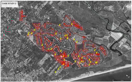 Case Study 2, the water distribution network of Quinta do Lago, located in south Portugal, supplies 1.7 Mm3/year of water mainly to domestic consumers and hotels (Figure 4). The system is located in a touristic area, and the water demand in summer is 4.5 times the demand in winter. The network comprises one single storage tank and 72.8 km of pipes, ranging from 63 to 400 mm in diameter. The predominant pipe materials are PVC (53%) and asbestos cement (44%). Water consumption is measured by a telemetry system every hour at each of the 2000 clients. Pressure is measured every minute at seven locations within the distribution system.