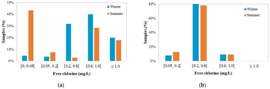 In Case Study 2, the water quality dataset also showed that the microbiological parameters were null almost all the time, while free chlorine was the parameter that was most frequently measured. In the winter period, a total of 33 locations within the system were sampled for chlorine concentration measurement over 8 years (2008–2010, 2012–2015, 2017). A total of 65 samples were analysed for free chlorine. In the summer period, 41 locations were sampled and 87 samples were collected. The results of chlorine monitoring in the system show that about 80% of the samples had a chlorine content within the optimum range (0.2 to 0.6 mg/L) in both seasons (Figure 5b).