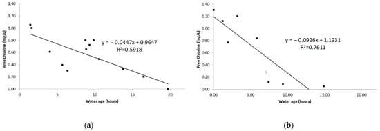 The chlorine variation with water age was determined for both case studies and for each season, based on collected chlorine data (Step 2) and on the water age estimated by extended-period simulations (Step 3) at the same nodes. The results show that the mean chlorine concentration at the sampled nodes generally decreased with increasing water age for both case studies and in both seasons (Figure 6 and Figure 7). Linear regressions were fitted to obtain relationships to describe the variation in water age with the chlorine concentration.