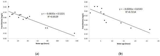 For Case Study 2, good correlations between the mean water age and mean chlorine concentrations at the nodes were also obtained, since the coefficients of determination of the linear regressions were 0.85 in winter and 0.72 in summer (Figure 7). The slope of the obtained equation was also higher in summer than in winter. Consequently, chlorine decays faster and reaches close-to-zero values in about 33 h in summer, while it takes 149 h in winter. Thus, the water age can be related to the chlorine concentration in the Case Study 2 system by the following Equations (7) and (8).