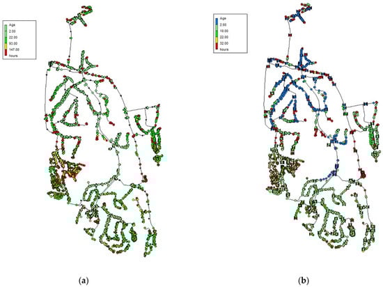 Water age distribution over the network in Case Study 2 (a) in winter and (b) in summer.