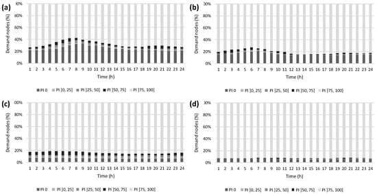 The application of the specific performance function to the Case Study 1 network in winter conditions shows that the performance index is higher than 0.75 at about 57% to 73% of the consumption nodes, depending on the hour of the day (Figure 11a). However, for 21% to 33% of the nodes, the performance is null, as a result of the water age being higher than the upper limit (21 h). In summer, the percentage of nodes that are supplied with good-quality water (PI > 0.75) increases (73% to 85% of the nodes), and only about 14% to 21% of the nodes are supplied with water that has been in the network for more than 16 h, for which the performance is null (Figure 11b). Accordingly, the global performance of the system increases from 0.68 in winter to 0.77 in summer (Table 1). These results demonstrate that the lower water demand in winter has a worse effect on water quality, by increasing travel times and water stagnation, than the temperature increase in summer, since it is counterbalanced by increased water consumption.