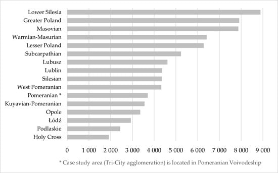 Residential, sacral, and greenery monuments are the most frequent types of non-moveable monuments in Poland. The number of non-movable monuments in voivodeships in Poland is presented in Figure 1.