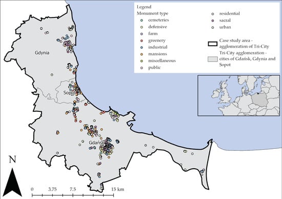 The study area covers an area of ca. 418 sqkm within the administrative borders of the Tri-City. Figure 2 presents the case study area together with the locations of the non-movable monuments.