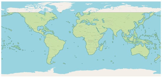 Digital elevation models are arranged into tiles, each covering one degree of latitude and one degree of longitude, named according to their southwestern corners. “SRTM 1 Arc-Second Global” dataset provides elevation data with worldwide coverage of data at a resolution of 1 arc-second (30 m) and open distribution of this high-resolution global dataset (some tiles above 50° north and below 50° south latitude are sampled at a resolution of 2 arc-second by 1 arc-second). Data were obtained from the “Earth Explorer” service of the United States Geological Survey (USGS) website []. Access to the data is free, and only a free registration on the site is required. The spatial coverage of tiles available for download is shown in Figure 3.
