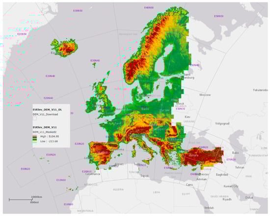 European Digital Elevation Model EU-DEM v1.0 is a digital elevation model of European Environmental Agency (EEA) countries (EEA member countries—Austria, Belgium, Bulgaria, Croatia, Cyprus, Czechia, Denmark, Estonia, Finland, France, Germany, Greece, Hungary, Iceland, Ireland, Italy, Latvia, Liechtenstein, Lithuania, Luxembourg, Malta, Netherlands, Norway, Poland, Portugal, Romania, Slovakia, Slovenia, Spain, Sweden, Switzerland, Turkey, and United Kingdom; cooperating countries—Albania, Bosnia and Herzegovina, Kosovo, Montenegro, North Macedonia, and Serbia). The EU-DEM is a hybrid product based on Shuttle Radar Topography Mission (SRTM) and Advanced Spaceborne Thermal Emission and Reflection Radiometer (ASTER) Global Digital Elevation Model (GDEM); data were fused by a weighted averaging approach. The EU-DEM v1.1 is a resulting dataset of the EU-DEM v1.0 upgrade. A number of properties were upgraded, for example, geo-positioning and vertical accuracy. EU-DEM v1.1 upgrade was coordinated through the Copernicus program [].