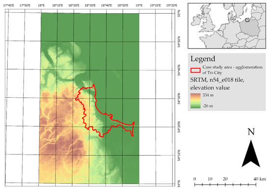 The following raster tiles, covering the case study area, were downloaded from the respective raster data hosting services: SRTM—n54_e018, EU-DEM—E40N30M, and Polish DEM—a mosaic of 136 rasters, N 54° from 36′15″ to 16’15″, and E 18° from 58′7″ to 20′36″. The downloaded raster tiles are presented in Figure 6, Figure 7 and Figure 8.