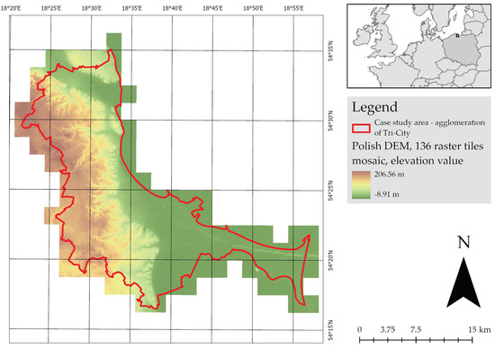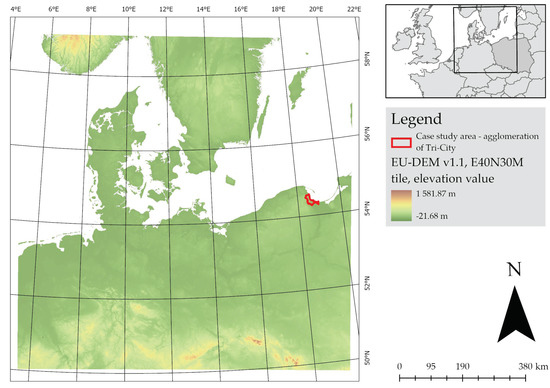 The study area of Tri-City. Source: own elaboration using ArcGIS Pro 2.7, on the basis of the data from The National Heritage Board of Poland and Polish National Register of Borders [].
