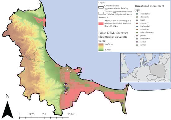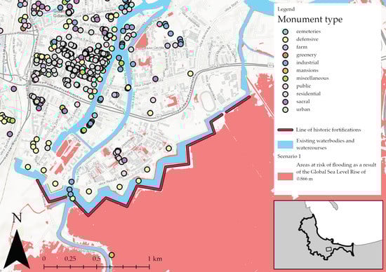 Research on climate change and its threats is in its early stages, and relational measures of citations of articles on this topic are very low, confirming that the thematic approach is new [,]. The research conducted by the authors fills the gap in this area and expands the knowledge in the topic of the vulnerability of effects of global warming. Global sea level rise threats affect various spatial aspects, primarily related to developed land. In this study, the authors focused on the threat to cultural heritage sites; the study covered the Tri-City agglomeration area in northern Poland.