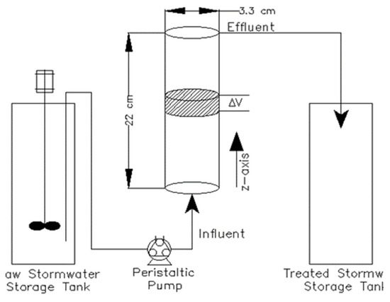 A technique to solve this issue is to perform laboratory batch and column experiments or pilot-scale trials to evaluate the performance of filter materials. However, such experiments can be time-consuming and expensive especially if a column trial is run until the break-through of studied elements [23]. Usually, synthetic stormwater is used, which will not reflect in situ conditions with real road runoff. In order to shorten the length of the experiment, a modeling tool can help to predict the life of a certain filter media. However, any model input data must be as realistic as possible in terms of hydraulic loading rates, filter media particle size and composition of the stormwater used in the experiment [24,25,26]. Jourak et al. [27] executed the convection-dispersion equation in the HYDRUS-1D software to predict the phosphate breakthrough curve for columns filled with the reactive filter material Filtra P. They concluded that the model was suitable for systems fed with a low influent concentration of phosphate, which probably would be valid for different metals. McKenzie et al. [28] developed a model in MATLAB where the soil-water distribution coefficient and the ratio of the drainage area to the infiltration-based stormwater treatment area, i.e., loading ratio (LR) was used for the simulation. The hydrogeologic and solute transport components were then decisive for the model output. Huber et al. [11] suggested a standardized method to determine the service life of filter materials used in decentralized stormwater treatment systems. Their method consists of several steps and considers preloading the filter media in a pilot-scale model with copper and zinc by a load of n-1 years of the estimated service life (n). They concluded that column experiments should be preferred to batch experiments to determine efficiencies and service lifespans.