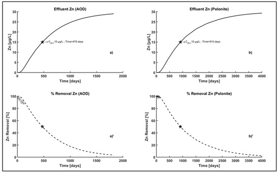 Capability of the model. Profile of the concentration and percentage removal of Zn within time for AOD and Polonite. Star indicates the maximum limit value according Järfälla municipality and circles refers to the experimental data. (a)’ and (b)’ are the percentage removal of Zn correspondingly to (a) and (b).
