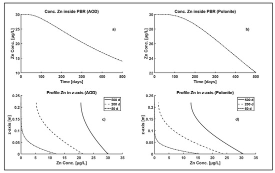 In this simulation, the operation time was set to 500 days to show the gradient of the concentration of Zn at different times. Figure 6a, b show the profile of the concentration of Zn in the PBR for AOD and Polonite, respectively. After 500 days, the concentration of Zn in the PBR (i.e., in the solid phase) is lower for the AOD than Polonite.