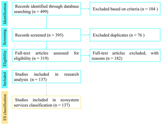 In some cases [1,2,13], it was a review that was not originally detected by the Scopus database. In the case of debatable articles, we performed a cross-check reading. Finally, 138 studies were retained for detailed reading, analysis of the data, and classification of ecosystem services.