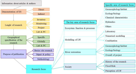 Based on the Excel database, we made a systematic literature research database containing information about the articles (year of publication, name of journal) and authors (identity of the research team). After that, we collected data from each of the 138 articles to capture all important data (Figure 2). We extracted information on whether ES data of LW were presented directly; the duration of the research (inventory <1 year, monitoring 1–3 years, project >3 years, and laboratory and numerical modeling); geographical specifications of the research area (geographical location with continent and country of the research, including only research with applied location and excluding laboratory and modeling research without a particular studied locality); the purpose of the publication (basic site research, management and policy, methodology); the main area of the research focus (ecosystem function and processes, modeling of LW, river restoration, society); the specific area of the research focus. Basic site research was characterized papers focused on field survey with the goal of mapping LW and its characteristics. Management and policy papers focused on recommendations on the inclusion of LW for river management, and methodology papers described new methodological approaches mainly regarding field surveys. These data were prepared for further ecosystem services classification.
