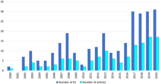 Time distribution of the published articles and detected ES per year (between 2000 and 2020).