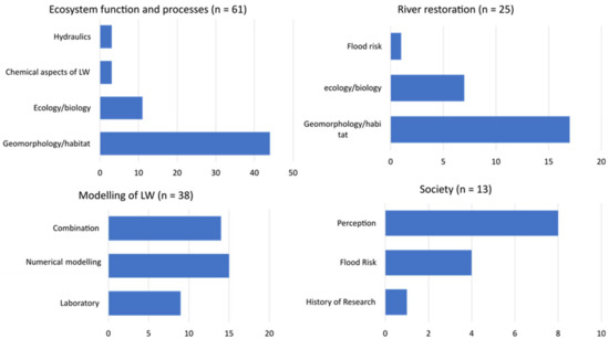 Figure 4 presents an overview of the specific research areas. Most of the papers classified into ecosystem function and processes were on geomorphology/habitat (n = 44). We found it interesting that only a small number of articles were focused on the chemical aspects of LW (n = 3). We consider this topic important because it regards water quality and carbon sequestration. Numerical modeling (n = 15) was more used than laboratory modeling. A considerable number of articles (n = 14) combined numerical modeling with another type of research, e.g., laboratory experiments that were later tested in the field. The highest number of articles categorized as river restoration focused on geomorphology/habitat (n = 17), and only few articles considered the flood risk of river restoration (n = 1). As shown in Figure 4, the society papers included the flood risk (n = 4), perception of LW (n = 8), and history of LW research (1) categories.