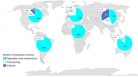 We summarize the results obtained from the transformation of information from the articles into ES. First, we calculated the number of articles relevant to each category. If data from one article were appropriate for two categories, we classified the article into both. The highest number of articles was classified in the regulation and maintenance section (n = 125), followed by the provisioning section (n = 16), and the cultural section (n = 11). The geographical distribution of the detected ES section was disproportional (Figure 5). Figure 5 shows the geographical distribution of ES sections on each continent.