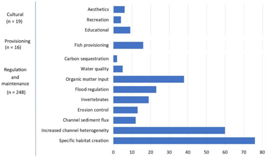 Focusing on individual ES classes from each section (Figure 6), the highest number of articles was classified in the specific habitat creation (n = 76) and increased channel heterogeneity (n = 60) classes from the regulation and maintenance section. The lowest number of articles was in the carbon sequestration class (n = 2). The provisioning section was represented only by fish provisioning (n = 16) and included articles that focused on the different effects of LW on the fish population. The cultural section included aesthetics, recreation, and education. We found that aesthetics and education were associated and appeared together six times. The lowest number of articles involved recreation (n = 3), which reflects the limited interaction between LW and society.