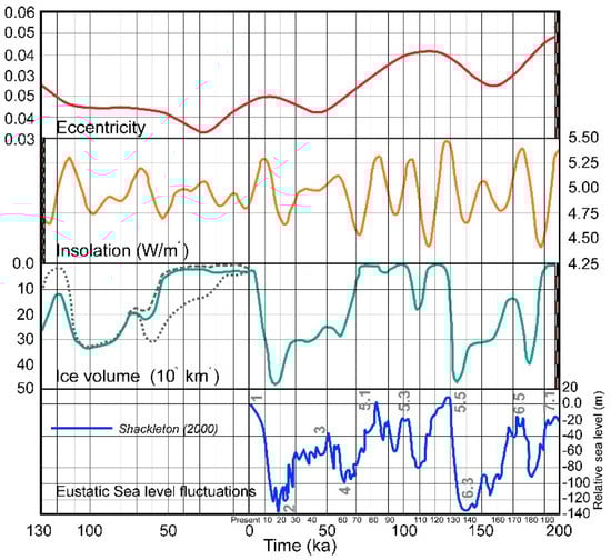 Long-term variations of eccentricity (top), June insolation at 65° N (middle), and simulated Northern Hemisphere ice volume (increasing downward) (bottom) for 200,000 years before the present to 130,000 from now. Time is negative in the past and positive in the future. In the Ice volume graphic for the future, three CO2 scenarios were used: last glacial–interglacial values (green solid line), a human-induced concentration of 750 ppmv (grey dashed line), and a constant concentration of 210 ppmv (grey dotted line). In the Eustatic Sea level fluctuation graphic the gray numbers represent the Medium isotope stages. Simulation results from [9,10]; eccentricity and insolation from [11]. Figure modified from [10,12].
