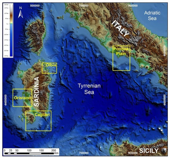 Located in Italy, south of Rome, the Pontina Plain is bordered to the north by volcanoes and pyrso-clastic deposits of Albani hills, to the east by the Lepini and Ausoni mountains (Mesozoic carbonates complexes) and to the west by the Tyrrhenian Sea (Figure 12). This area is characterized by a distensive tectonic regime, that was active during the Pliocene and the Quaternary, linked with the tectonic opening of the Tyrrhenian Sea. In this context, the Pontina Plain represents a sector of particular geological complexity, as the interaction of the sea level changed with neotectonic phenomena.