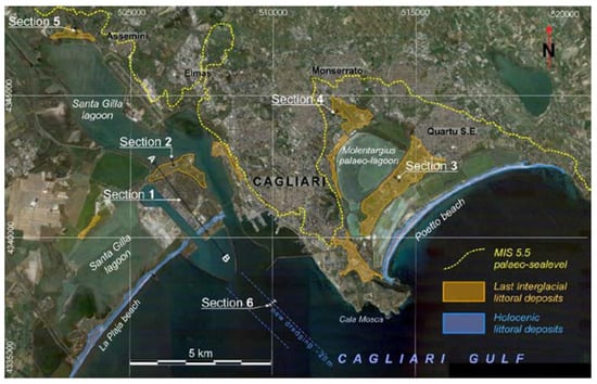 The western bay deepens into the plain for about 15 km. The MIS 5.5 transgression internal margin presents a marine terrace at Cerastoderma glaucum [28], from which a strip was found at +3.40 m (Figure 5, Section 5). The coastal paleo-spit marine deposits of Sa Illetta, which closed the paleo-lagoon of Santa Gilla, were found up to an altitude of +4.30 m, while in correspondence of the two lagoon paleo-mouths of the MIS 5 fossiliferous levels are found at −2 m (east lagoon-mouth) and −5 m (west lagoon-mouth—La Plaja coastal spit).