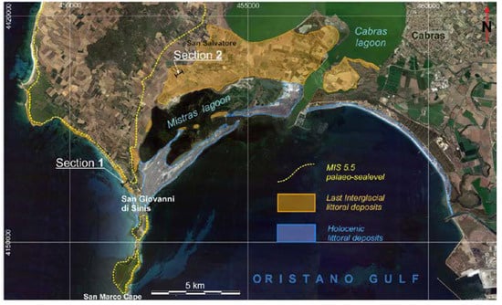 The MIS 5.5 marine-littoral deposits sequence is most preserved along the western coast of San Giovanni di Sinis [37].