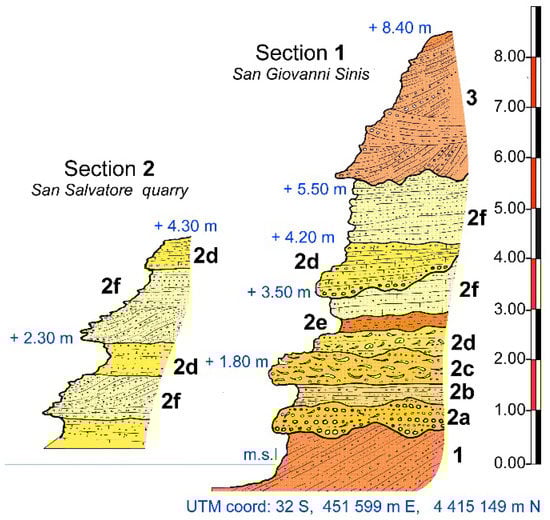 Stratigraphic sections of the medium-upper Pleistocene sequences in Oristano’s north coastal plain and in the Sinis peninsula. (1) (Section 1): eolian sandstones with inclined layering laminae containing vertebrate remains (MIS6); (2a): polygenic heterometric conglomerate with a fossiliferous arenaceous matrix (MIS 5); (2b): sandstones and micro-conglomerates mainly quartz with carbonate cement (MIS5); (2c): almost exclusively organogenic level in Mitilus galloprovincialis (MIS5); (2d): fossiliferous conglomerate and micro-conglomerates with a well-cemented arenaceous matrix (MIS 5); (2e): sandy palaeo-soil with a strongly oxidized matrix, Munsell 5YRS 5/8; (2f): planar-parallel lamination sandstones alternating with foreset levels (MIS5); (3): cross-laminated aeolian sandstones containing foraminifera and gastropods pulmonata Helicidae (MIS 4?) [36,37].