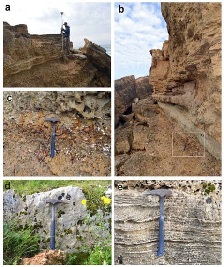 (a) DGPS measurements of the stratigraphic section of the Pleistocene deposits of San Giovanni of Sinis; (b) a view of the section of the San Giovanni stratigraphic showing continental deposits of the Middle Pleistocene and deposits of the last interglacial fossilized by regression aeolian sediments [8,36,37] (Figure 8); (c) particular of the organogenic level composed exclusively of valves of Mitilus galloprovincialis (MIS5); (d) excavation surface of the Phoenician-Punic quarry (2500 yrs BP) engraved in the MIS 5.5 beach sandstones in the paleo-littoral spit of Cabras; (e) detail showing the plane-parallel laminations that enclose a foreset level.