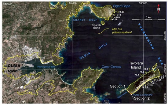 Aerial photograph of the coastal plain and the Gulf of Olbia, between the Figari Cape to the north and the Tavolara Island to the south, yellow dashed line indicates the paleo high sea level of MIS 5.5. Location of MIS5 stratigraphic sections (Figure 10): Section 1, on the Tavolara Island, east coast of the bay of Spalmatore. Section 2, near the promontory of Punta La Mandria, southernmost point of the Tavolara Island and elevations of the tidal notch of the MIS 5.5 [39].