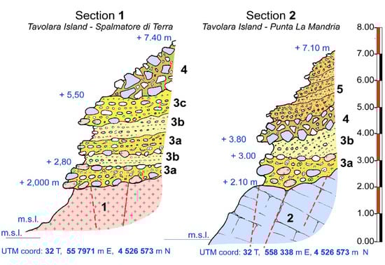 The MIS 5 fossiliferous deposits of Spalmatore di Terra (Tavolara Island), in high energy facies (conglomerates and micro-conglomerates) reach +5.5 m (Figure 11, Section 1).