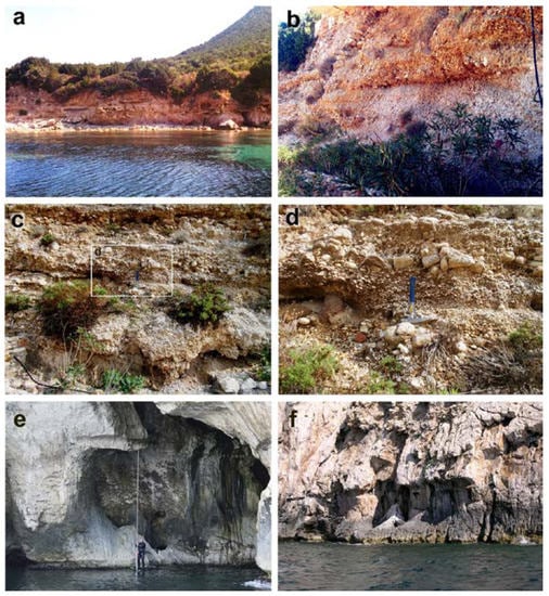 MIS 5.5 deposits in the Olbia Gulf were first described by Segre [38], which indicated extensive outcrops of conglomerates and fossiliferous sandstones along the northern coast of Golfo Aranci and along the southern coast of Tavolara Island in front of Spalmatore Bay (Figure 9).
