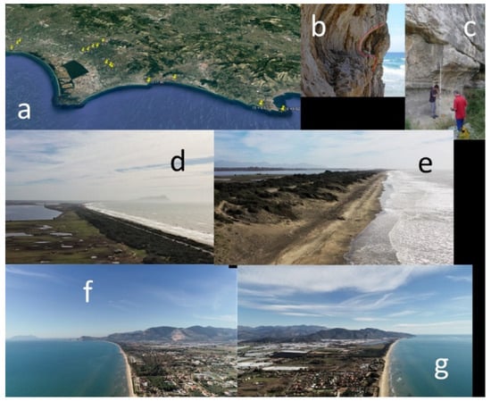 (a) Google Earth image of the Pontina and Fondi Plain with the carbonatic promontory of Terracina, Sperlonga on which are carved the fossil tidal notches; (b,c) aged MIS 5.5, the yellow arrow indicates the sample’s number and altitude (see Table 3) Pianura Pontina e di Fondi; (d) the coastal area of northern Pontina Plain (on background, the limestone Circeo promontory); (e) the coastal area of northern Pontina Plain (on background, the limestone Terracina promontory; (f) the coastal area of the Fondi Plain (on background, the limestone Terracina Promontory; (g) same point but a southern view, with Sperlonga promontory.