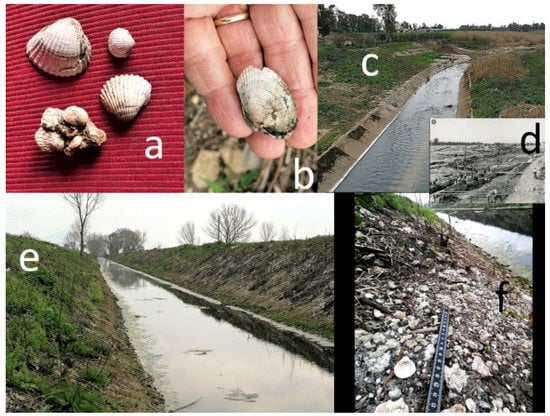 (a) Cerastoderma edulis sampled in a section outcropping in the channel of this figure in (e); (b) Tapes decussatus from the outcrop on the reclamation drainage c channel; (c,e) the channel (d), the Mussolini channel during the excavation in the 1930s; (f) the outcrop Nassa mutabilis Tapes decussatus, Cerastoderma edulis; (f) a fossiliferous level very rich in lagoon fauna. See also Table 3 site 7.1.
