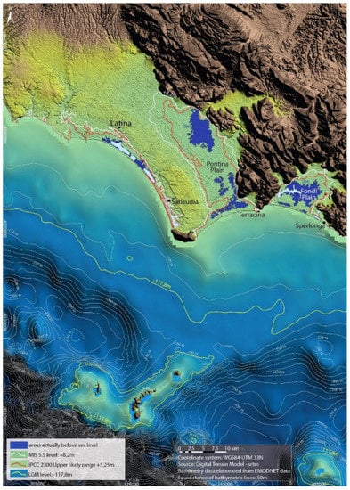 On the basis of the maximum altitude of the highstand reached during the MIS 5.5 of 8.2 m, [47] and the present altitude of the Pontina Plain maps (Table 1), it was possible to reconstruct the transgressive event that occurred 119 ka BP: a gulf that forwards in a NW direction for about 32 km, with a total flooded area of 401.42 km2 (Table 4) and about 100 km of coastline involved in the transgression of 119 ka BP (Table 2). This high sea stationing event is demonstrated by the data (forms and deposits) emerging in the plain and described in the previous chapter. Based on the IPCC 2019 data, in 2300 the maximum elevation of the sea will be 5.249 m higher than in 2019. Based on the elevation of the Pontina Plain maps it was possible to reconstruct the possible future transgressive event (Figure 15), provided that “man” does not carry out any anthropic building (dams, genic interventions (dams, water pumps, etc.). Figure 15 shows a gulf that will extend into the Pontina Plain for about 26 km and that could have a total flooded area of 306.67 km2.