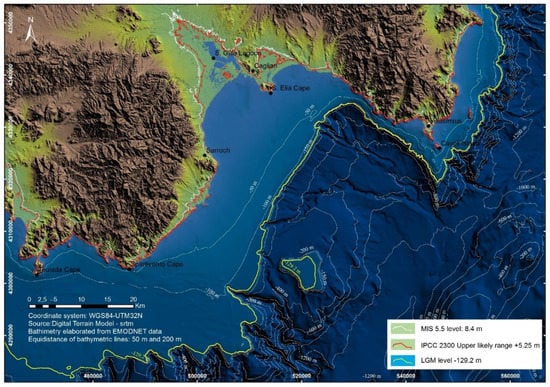 To link the land surface to the seafloor along the coasts and represent MIS 2 sea level, the bathymetric data were obtained from the European Marine Observation and Data Network (EMODnet, http://portal.emodnet-bathymetry.eu/ [25]—(accessed on 16 December 2020). The DTM has been generated from selected bathymetric survey data sets, composed by DTMs and satellite derive bathymetry (SDB) data products, while gaps of no data coverage were completed by integrating the GEBCO digital bathymetry. The spatial resolution of this DTM was 85 × 85 m while the vertical resolution was 1 m. However, the use of different resolution DTMs for the emerged and submerged part did not lead to differences in the elaboration of flood models; this is mainly due to the fact that the high-resolution DTM was available for the entire emerged sector, up to the current coastline.