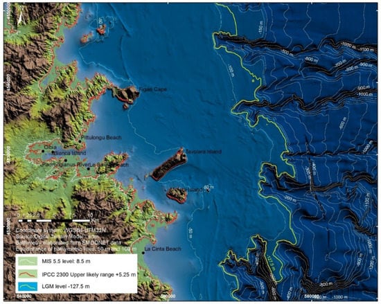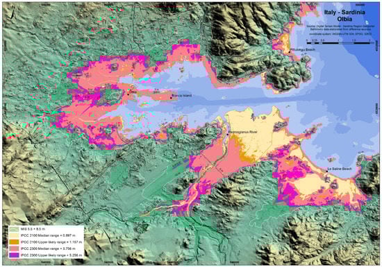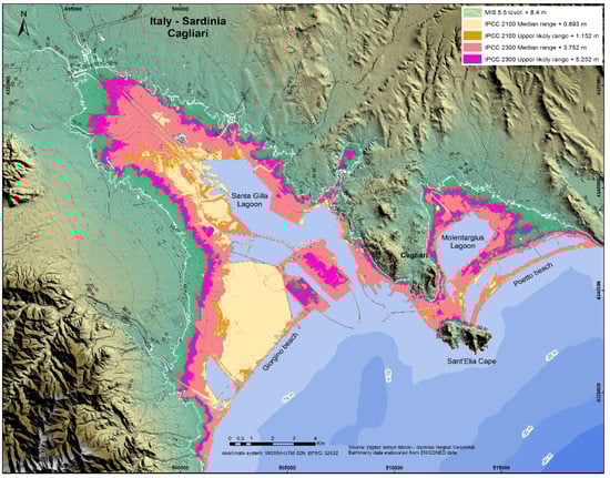 The northern sector of the Gulf of Cagliari is characterized by a flood plain with a low slope towards the south. In this sector, during MIS 5.5, the maximum altitude of +8.4 m above current sea level originated two bays: one to the west (current Laguna di Santa Gilla) with a retreat of the shoreline of about 16 km and one to the east (current Molentargius) with 6 km of retreat. The Sant’Elia promontory was isolated from the mainland and represented an island or was probably connected to the coast through a tombolo. The map shows that in MIS 5.5, the marine transgression affected the coastal sector wide 27 km with a flooded area of 131.54 km2. The same map shows the maximum level of + 5.25 m compared to the sea level for the year 2300 based on IPCC 2019 data; in particular, the map shows a scenario which 87.24 km2 of coastal areas submerged; the sea level rise would lead to the demolition of the Holocene littoral spits with a shoreline retreat of 16 km and 14 km, respectively, for the Santa Gilla and Molentargius lagoons and the subsequent formation of bay beaches (Figure 16 and Figure 17).
