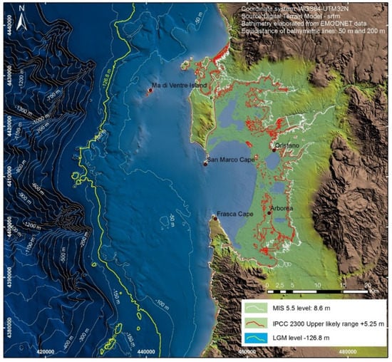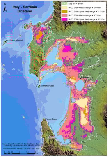 In the Gulf of Oristano, the MIS 5.5 shoreline reaches a maximum level of +8.5 m a.s.l. In addition, for this sector the slope is very low; there is a maximum shoreline retreat of about 13 km and a submersion area of about 376.77 km2. The map shows the maximum level of +5.25 m above sea level for the year 2300 based on IPCC 2019 data. This scenario would lead the demolition of the Cabras and Santa Giusta littoral spits, the submersion of 230 km2 in a sector of coastline that extends for 103 linear km and the retreat of the Tirso River mouth towards the northeast (Figure 18 and Figure 19).
