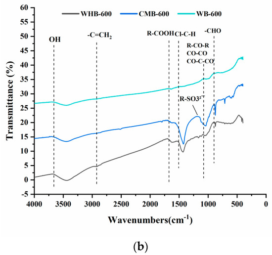 | Functional Group | WB 300 (%) | WB 600 (%) | CMB 300 (%) | CMB 600 (%) | WHB 300 (%) | WHB 600 (%) |