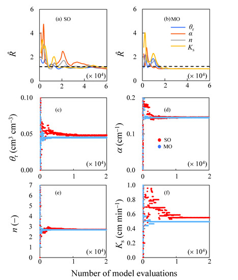 Figure S1: Trace plots of the inverse modeling for the loam example: (a) the Ȓ-statistic with the SO approach; (b) the Ȓ-statistic with the MO approach; and (c–f) are mixed changes in the parameter value with evaluations along three Markov chains. Figure S2: Trace plots of the inverse modeling for the clay example: (a) the Ȓ-statistic with the SO approach; (b) the Ȓ-statistic with the MO approach; and (c–f) are mixed changes in parameter value with evaluations along three Markov chains.