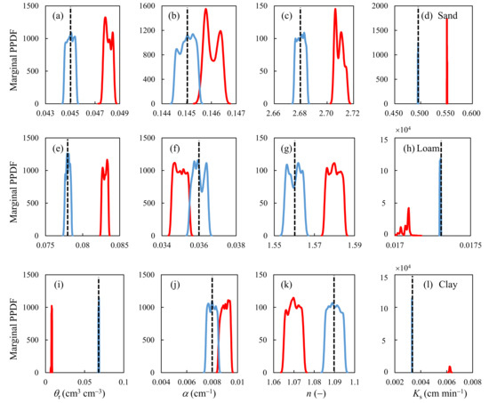 The marginal posterior probability density functions (PPDF) of the parameters obtained from inverse modeling for the synthetic examples: (a–d) sand example, (e–h) loam example and (i–l) clay example. The red and blue curves were extracted from the SO and MO approaches, respectively, whereas the vertical dashed line denotes the exact value.