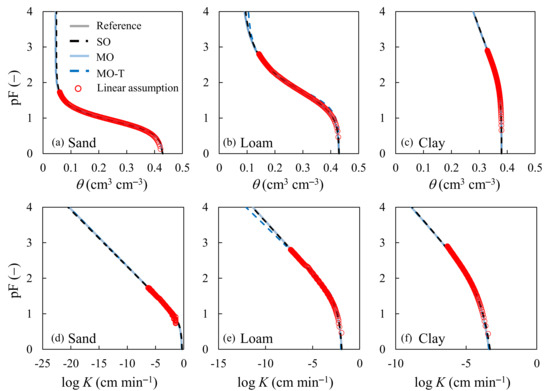 Water retention (a–c) and hydraulic conductivity (d–f) functions that were obtained from different methods. The SO and MO curves were extracted with the MAP value of the parameters. MO denotes the inversion results of using the exact ha value of −103 cm for the sand and loam examples and −105 cm for the clay example. The results of MO-T were obtained using a different ha value that was ten times the exact one.