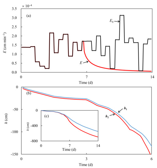 where h* and h are the measured and simulated pressure heads, respectively, and Nh is the total number of available pressure head data for the inverse modeling. The measured evaporation rate is used in the SO optimization strategy as a known flux boundary condition that is described in Equation (6).