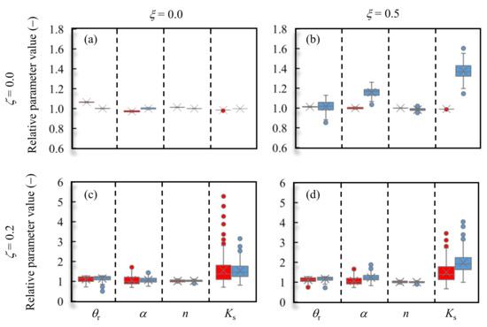 Box diagrams of the inversion parameters obtained from the SO (red) and MO (blue) approaches for the loam example: (a) both ξ and ζ are zero; (b) ξ = 0.5 and ζ = 0.0; (c) ξ = 0.0 and ζ = 0.2; (d) ξ = 0.5 and ζ = 0.2. ξ is the relative oscillation level of the evaporation rate. ζ is the relative level of observation errors.