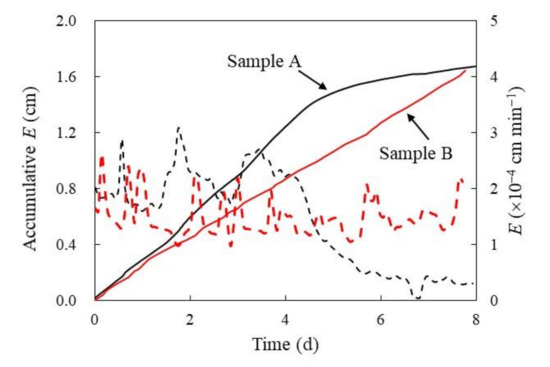 The duration of each experiment was close to 8 days. As shown in Figure 7, the evaporation of both samples experienced significant fluctuations, similar to stochastic oscillations, but only sample A experienced stage 2 evaporation. The average evaporation rates of stage 1 were approximately 0.00024 cm min−1 and 0.00015 cm min−1, respectively, for samples A and B.