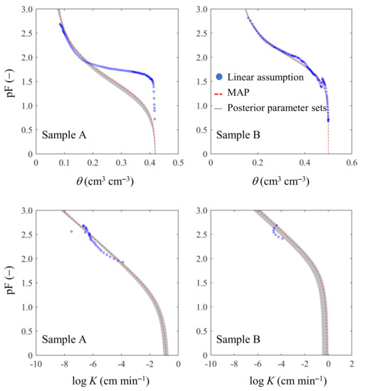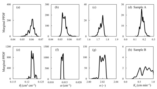 Figure 8 shows the marginal posterior distribution of the inversion parameters. As indicated, the parameter values generally had a normal or log-normal posterior distribution. The posterior distribution of Ks for sample B seemed to be cut by the upper bound of the prior range, suggesting that more prior knowledge regarding the hydraulic conductivity may be required. The MAP value and standard deviation of the posterior parameters are listed in Table 3. Cross-correlation may have existed between different inversion parameters and caused equifinality for different parameter sets. For example, θr and n of sample A were positively correlated with each other at a correlation coefficient that was close to 0.9. The inversion values of α and n for sample A had a negative correlation, as indicated by the correlation coefficient of −0.61. For sample B, the cross-correlation coefficients between different parameters were generally small, indicating a weaker equifinality for different parameter sets.